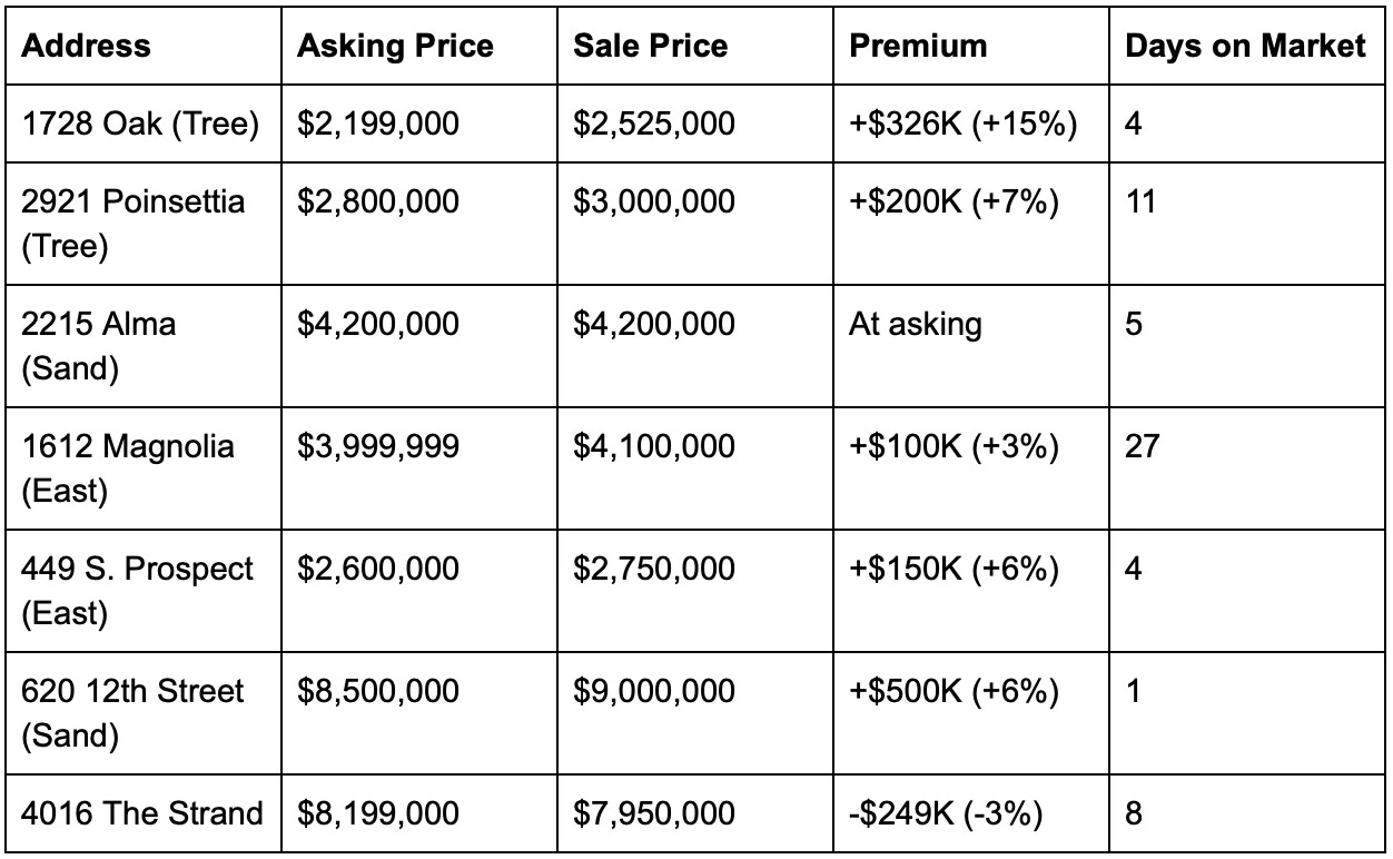 At 2215 Alma, a custom remodel with ocean views listed at $4.2 million on a Friday. It went under contract the following Monday. It closed 11 days later at full asking price. [1] At 1612 Magnolia, new construction closed at $4.1 million — 5% above the $3.999 million asking price, with five competing offers. [1] At 449 South Prospect, a single-level mid-century home on a cul-de-sac closed at $2.75 million, $150,000 over asking, after just four days on market. [1]