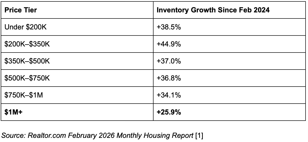 The most important chart in Realtor.com’s February report is one that most commentators glossed over. It shows inventory growth by price tier since February 2024 — right around when the national recovery started gaining momentum.