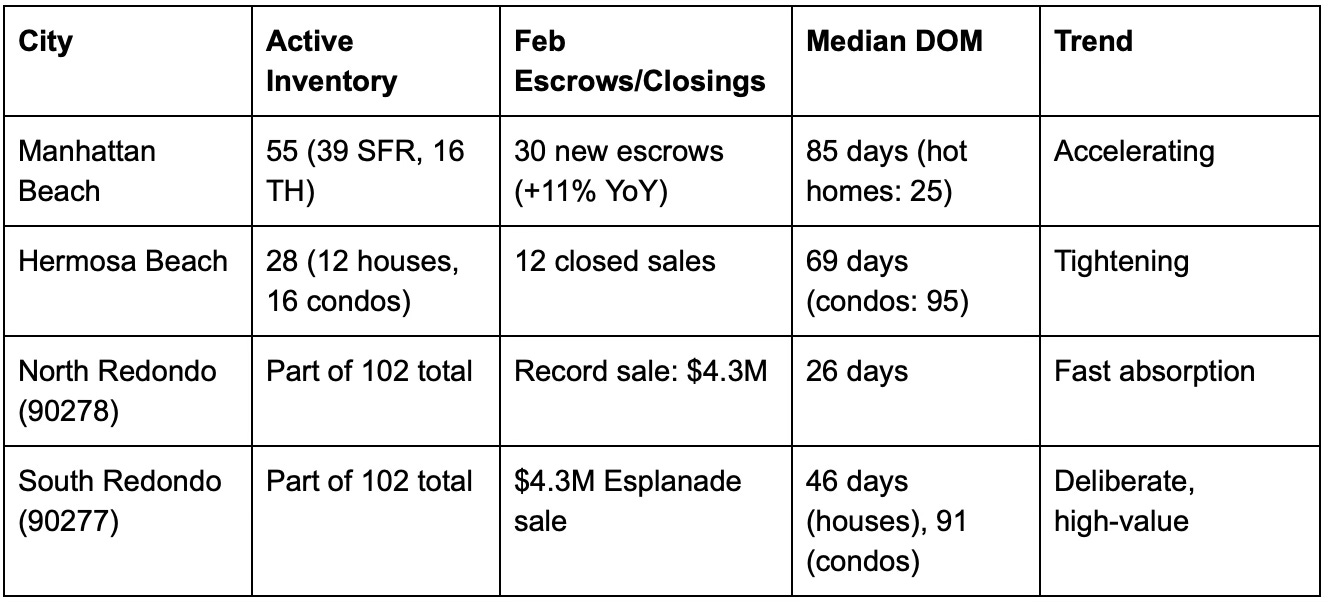 Manhattan Beach is getting busier, not quieter. Hermosa Beach is getting tighter, not looser. North Redondo is absorbing inventory faster than either of its neighbors, and South Redondo’s coastal market — while moving at a more deliberate pace — continues to attract serious capital at the highest price points.